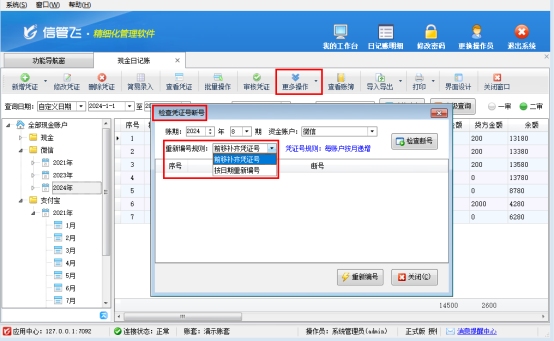 選擇賬期、資金賬戶、重新編號規則后,點擊“重新編號”按鈕,會按編號規則重新生成,如下圖所示: