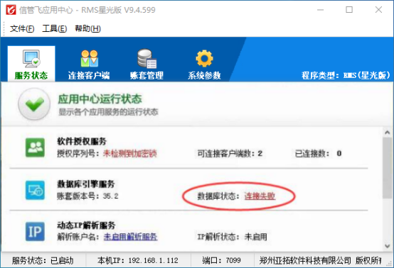 智能修復軟件環境完成后,請重啟應用中心程序,然后查看下數據庫連接狀態是否顯示為連接成功(如下圖所示),數據庫狀態為連接成功,則軟件即可正常登錄。