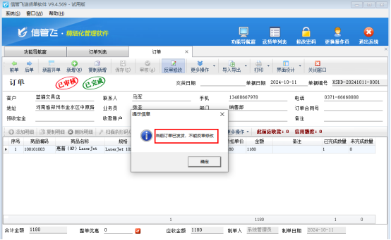通過采用送貨單軟件,企業可以顯著提升訂單處理的效率。一方面,嚴格的發貨后控制機制減少了不必要的訂單變動,降低了人工干預的頻率,從而提高了整體運營效率。另一方面,軟件內置的多種安全措施和備份機制,確保了訂單數據的安全性和完整性,為企業提供了堅實的數據保障。如控制已完成訂單不能修改和紅沖,訂單在修改或者紅沖時會彈出提示。