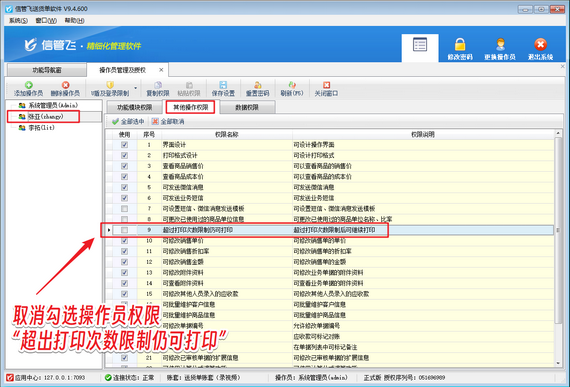 然后,在操作員權限管理中,取消操作員“超過打印次數限制仍可打印”的權限。