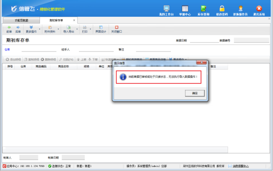 進入期初庫存單界面,點擊導入,提示“當前單據已審核或處于只讀狀態,無法執行導入數據操作!”,如圖: