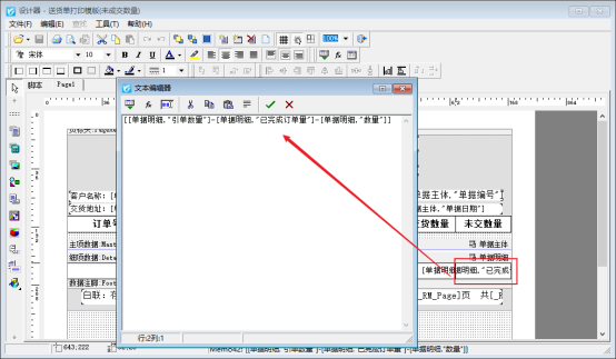 在模板設計器中選擇未交數量對應的細項數據文本框,雙擊打開文本框,調用表達式:[[單據明細."引單數量"]-[單據明細."已完成訂單量"]-[單據明細."數量"]],然后保存模板并預覽可看到已顯示。如下圖所示:
