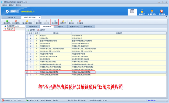 解決方法如下:使用系統管理員賬號登錄軟件,在功能導航窗點擊“系統管理”—》“操作員及授權”打開操作員管理及授權界面,選擇操作員賬號,在“其他操作權限”界面將“不可維護出納憑證的核算項目”權限勾選取消,然后保存權限設置,如下圖所示。