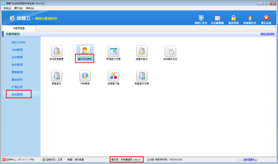 系統管理員登錄軟件,在功能導航窗點擊“系統管理”—》“操作員及授權”,進入“操作員管理及授權”界面,選擇操作員“張亞”,在其右側的功能模塊權限內選擇“綜合管理”模塊,將員工借款管理的“刪除”權限勾選取消,然后保存設置,如下圖所示。