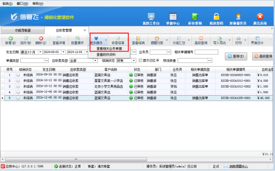 修改需要打開對應的單據進行修改單價或者數量進行更新金額。點擊工具欄“更多操作”下的“查看相關業務單據”會打開業務單據界面,單據修改后更新應收金額,如下圖所示: