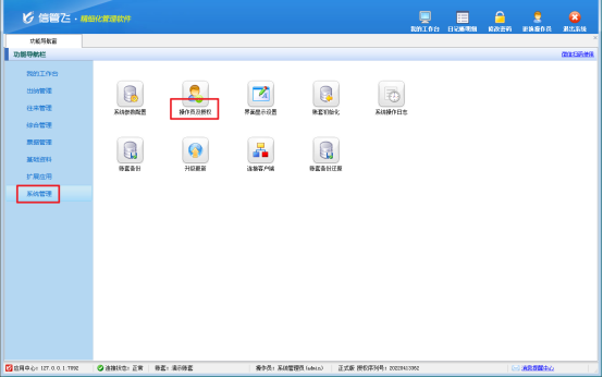 系統管理員登錄軟件,在功能導航窗點擊“系統管理”—》“操作員及授權”,進入“操作員管理及授權”界面,選擇操作員“張亞”,在其右側的功能模塊權限內選擇“票據管理”模塊,將進/銷項發票管理的“刪除”權限勾選取消,然后保存設置,如下圖所示。
