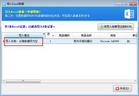 銷售單開單界面,直接導入EXCEL明細出現提示“導入失敗,必填數據項為空”,這是因為軟件里面某些數據項設置了必填,表格里面卻沒有數據導致的,如圖: