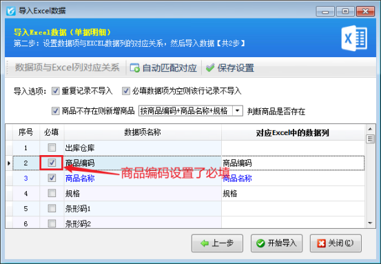 解決方法如下:開單界面點擊“導入導出”-》“從EXCEL導入明細”重新進行導入操作,之后查看軟件設置的必填項,與表格數據項進行對照,如圖所示,軟件內商品編碼設置了必須填寫,表格中商品編碼處卻顯示為空,沒有數據,在軟件中選中商品編碼數據項,鼠標右鍵取消必填標志,取消后點開始導入,明細即可導入成功。