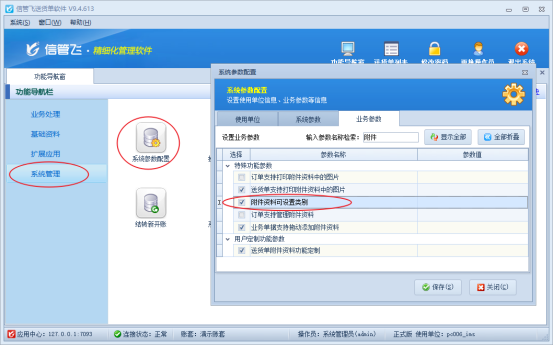 在功能導航窗點擊“系統管理”----“系統參數配置”----“業務參數”勾選送貨單附件資料功能定制,保存設置。如下圖所示: