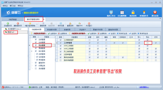 具體操作步驟簡單明了:登錄軟件后,進入“系統管理”的“操作員及授權”界面,選擇對應操作員并取消其工資單管理的“導出”權限,保存設置即可。