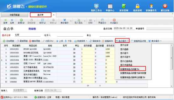 3.批量更新盤點數(shù)量:商品選擇完成后,在明細工具欄的盤點操作下,選擇 “批量更新盤點數(shù)量為 0”,軟件會直接批量設(shè)置商品盤點數(shù)量為 0,方便又高效。