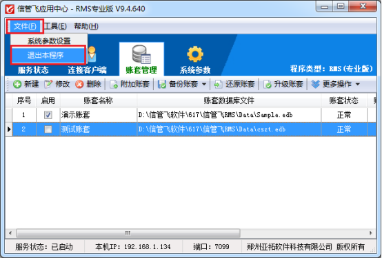保存修改后,再次查看賬套列表,會(huì)發(fā)現(xiàn)該帳套的啟用對(duì)勾已經(jīng)取消,這表明該賬套已成功停用。為了確保設(shè)置生效,可以點(diǎn)擊“文件”—》“退出本程序”,先退出應(yīng)用中心,然后再重新運(yùn)行紅色應(yīng)用中心。