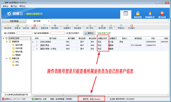 權(quán)限設(shè)置完成后,使用操作員賬號(hào)登錄軟件,在功能導(dǎo)航窗點(diǎn)擊“基礎(chǔ)資料”—》“客戶信息”打開客戶信息界面,可看到操作員賬號(hào)只能查看到業(yè)務(wù)員為自己的客戶信息,如下圖所示。