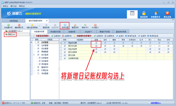 使用系統(tǒng)管理員賬號登錄軟件,在功能導(dǎo)航窗點擊“系統(tǒng)管理”—》“操作員及授權(quán)”打開操作員管理及授權(quán)界面,選擇操作員賬號,在其右側(cè)的功能模塊權(quán)限內(nèi)選擇“出納管理”,將現(xiàn)金(銀行)日記賬的“新增”權(quán)限勾選上,然后保存權(quán)限設(shè)置,如下圖所示。