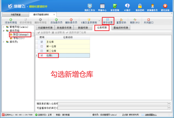 之后點(diǎn)擊“系統(tǒng)管理”—》“操作員及授權(quán)”進(jìn)入操作員管理及授權(quán)界面,在權(quán)限模塊中可看到啟用的“倉庫權(quán)限”,選擇操作員“張亞”,點(diǎn)擊倉庫權(quán)限,設(shè)置操作員“張亞”勾選使用的倉庫信息權(quán)限,保存設(shè)置,如圖: