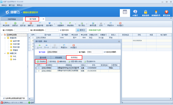 進(jìn)入軟件功能導(dǎo)航窗,選擇 “基礎(chǔ)資料” 中的 “客戶信息”,找到目標(biāo)客戶后點(diǎn)擊 “修改”。在客戶信息修改窗口中,“基本信息” 欄的 “詳細(xì)地址” 默認(rèn)為核心收貨地址,切換至 “收貨地址” 標(biāo)簽頁(yè),點(diǎn)擊 “添加地址” 即可彈出信息維護(hù)窗口。依次錄入收貨單位、聯(lián)系人、聯(lián)系電話、詳細(xì)地址等關(guān)鍵信息后保存,新增地址會(huì)直接同步至地址列表,支持隨時(shí)修改、刪除或設(shè)為默認(rèn)地址,一次維護(hù)即可長(zhǎng)期復(fù)用,無(wú)需反復(fù)錄入。