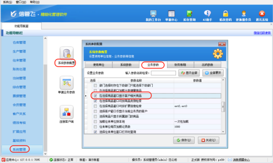 登錄軟件后,只需在功能導(dǎo)航窗中點(diǎn)擊“系統(tǒng)管理”,進(jìn)入“系統(tǒng)參數(shù)配置”模塊,選擇“業(yè)務(wù)參數(shù)”選項卡,在“數(shù)據(jù)選擇參數(shù)”欄目中,勾選“在選擇商品窗口顯示客戶相關(guān)商品”參數(shù),并點(diǎn)擊“保存”按鈕,配置即刻生效,無需重啟軟件即可立即體驗(yàn)。