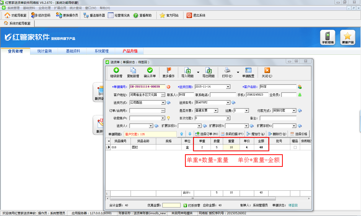亞拓軟件開發(fā)的紅管家送貨單軟件中支持按重量計算金額,由于多數(shù)用戶是按數(shù)量來計算金額的,因此在送貨單打印軟件中開單時,明細中的金額默認取單價乘以數(shù)量的值(即 金額 = 單價 * 數(shù)量),那么部分用戶的產(chǎn)品如果需要按重量計算金額(比如農(nóng)副產(chǎn)品)在送貨單管理軟件中又該如何進行設置呢?下面我們就詳細介紹下紅管家送貨單軟件中如何設置按重量來計算金額? &nbs