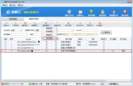 微信消息服務(wù)是信管飛軟件基于微信開放平臺研發(fā)的業(yè)務(wù)消息發(fā)送服務(wù),支持即時推送業(yè)務(wù)單據(jù)消息,如訂單通知、發(fā)貨信息等。支持客戶查看消息詳情(可配置外部查看數(shù)據(jù)項)、單據(jù)簽收確認(rèn)、分享轉(zhuǎn)發(fā)等功能。 若是綁定有誤或者更換綁定客戶或業(yè)務(wù)員可進(jìn)行解除綁定再重新綁定。如何取消綁定?本文以信管飛RMS軟件為例示范如下
