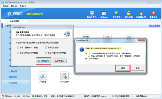 此文章演示視頻觀看鏈接:信管飛rms賬套初始化演示視頻 賬套初始化一般用于在正式使用軟件前,對(duì)賬套中的數(shù)據(jù)進(jìn)行初始化,以便重新錄入數(shù)據(jù)。也可以在開賬后,發(fā)現(xiàn)期初數(shù)據(jù)有問題時(shí),對(duì)數(shù)據(jù)進(jìn)行初始化,以便重新開始錄入期初。賬套數(shù)據(jù)初始化后,會(huì)直接刪除相應(yīng)的數(shù)據(jù),因此務(wù)必提前做好備份,謹(jǐn)慎操作! &n