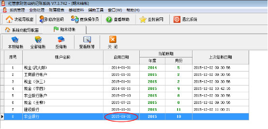 一、期末結(jié)賬功能描述 紅管家財務(wù)出納記賬系統(tǒng)包括期末結(jié)賬的功能,當(dāng)本期(即本月)的業(yè)務(wù)已審核處理完畢,就可以進(jìn)行期末結(jié)賬處理。結(jié)賬后自動進(jìn)入下一個賬期(月份),12月份結(jié)賬后將進(jìn)入下一個年度。結(jié)賬后如果發(fā)現(xiàn)單據(jù)錯誤或賬簿數(shù)據(jù)有誤,可以進(jìn)行反結(jié)賬處理。 點擊主窗口菜單“業(yè)務(wù)處理”——》“期末結(jié)帳”系統(tǒng)進(jìn)入“期末結(jié)帳”窗口,如圖1