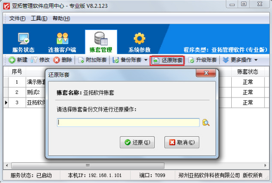 亞拓管理軟件、亞拓倉庫管理軟件中都含有賬套管理功能,賬套管理實現(xiàn)賬套數(shù)據(jù)庫的集中管理,包括新建賬套、修改賬套屬性、刪除賬套、附加賬套、備份賬套、還原賬套和升級賬套等功能。下面我們以亞拓管理軟件為例來演示一下賬套管理中各個功能具體的操作方法。 打開亞拓管理軟件應(yīng)用中心(桌面右下角紅色的圖標(biāo))—》“賬套管理”即可進(jìn)入賬套管理界面