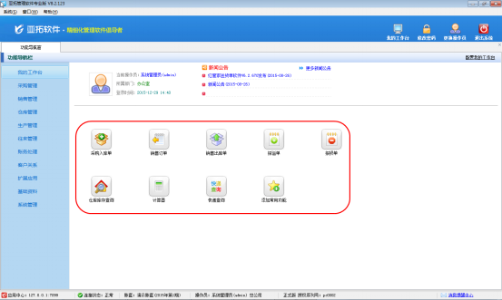 亞拓軟件開發的亞拓管理軟件、亞拓倉庫管理軟件、紅管家票據打印軟件等都包含我的工作臺功能,我的工作臺中可以查看當前操作員信息、最新的通知公告、業務提醒信息,并且可以添加一些常用的功能模塊。下面我們以亞拓管理軟件專業版為例詳細介紹下我的工作臺功能是如何使用的。 首先登陸亞拓管理軟件,點擊“功能導航窗”—“我的工作臺”,可以打開我
