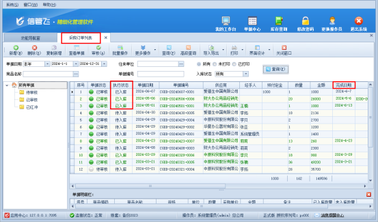信管飛RMS軟件、信管飛倉庫管理軟件等支持先下訂單,后期實際入庫可引單操作,有用戶咨詢需要查看已入庫狀態的訂單實際入庫時間,在軟件中如何查看?本文以信管飛RMS軟件為例進行示范。 有兩種方式進行查看,一種是采購訂單界面查看。打開采購訂單界面,在工具欄“更多操作”下點擊“查看訂單執行情況”,彈出界面可以查