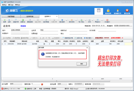 企業(yè)管理中,單據(jù)打印至關(guān)重要。但如何避免單據(jù)重復(fù)打印、修改單據(jù)導(dǎo)致的混亂?信管飛軟件為你提供完美解決方案! 信管飛軟件支持設(shè)置報表打印次數(shù)限制,確保單據(jù)打印的合規(guī)性。一旦打印次數(shù)達(dá)到預(yù)設(shè)上限,系統(tǒng)將自動提示,防止重復(fù)打印。 以信管飛送貨單軟件為例,通過簡單設(shè)置,即可實現(xiàn)操作員打印次數(shù)權(quán)限控