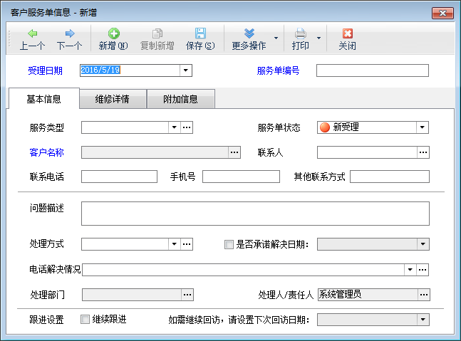 客戶服務(wù)管理即售后維修管理、技術(shù)支持管理、投訴反饋管理,亞拓管理軟件支持流程化的客戶服務(wù)管理,包括受理、分派、服務(wù)完工、跟蹤回訪等完整客服流程管理。對于維修性質(zhì)的服務(wù),軟件支持管理返修產(chǎn)品信息(故障產(chǎn)品名稱、批號、序列號、質(zhì)保情況等)和維修費(fèi)用,并可支持多達(dá)10個擴(kuò)展數(shù)據(jù)項。 在功能導(dǎo)航窗,點(diǎn)“客戶關(guān)系”—》“客戶服務(wù)管理”