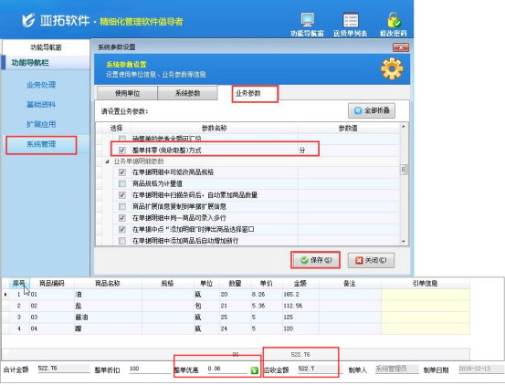 在銷售和采購(gòu)的過程中,會(huì)出現(xiàn)價(jià)格優(yōu)惠的情況,亞拓軟件的紅管家送貨單軟件和亞拓管理軟件支持兩種優(yōu)惠方式:打折優(yōu)惠、抹零取整。以抹零取整優(yōu)惠為示范,來展示下在軟件中如何設(shè)置抹零取整的默認(rèn)抹零單位,抹零取整有三種方式:元、角、分,軟件默認(rèn)選擇的價(jià)格參數(shù)是取整到“角”,我們以紅管家送貨單軟件為例,示范如何修改抹零取整的默認(rèn)抹零單位。
