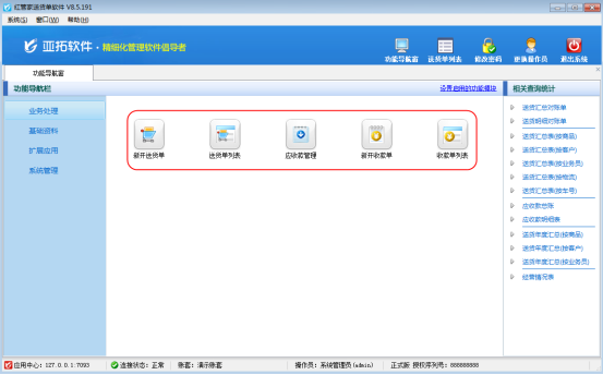 紅管家送貨單打印軟件是一款針對中小型企業開發的集送貨管理(發貨管理)、退貨管理(銷售退貨)、銷售收款(應收款管理)等功能為一體的送貨管理及打印軟件(送貨單打印軟件、發貨單打印軟件、出貨單打印軟件、收據打印軟件、貨單票據打印軟件)。 軟件界面默認顯示全部的功能模塊,主要包括新開送貨單、送貨單列表、應收款管理、新開收款單、收款單