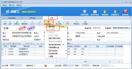 信管飛送貨單軟件、信管飛RMS軟件等支持開(kāi)銷售單之前先開(kāi)訂單。銷售單可以引用訂單進(jìn)行開(kāi)單。對(duì)于剛下訂單出錯(cuò)或者取消訂單的,軟件支持刪除訂單操作。以信管飛送貨單軟件為例,示范下如何刪除已審核的訂單單據(jù)? 訂單保存后可以在訂單列表中進(jìn)行查看,對(duì)于未審核未執(zhí)行的訂單,可以直接在訂單列表工具欄刪除按鈕進(jìn)行刪除