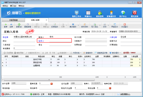信管飛RMS軟件、信管飛倉(cāng)庫(kù)管理軟件等默認(rèn)開(kāi)單的經(jīng)手人或業(yè)務(wù)員不允許為空,如果您在開(kāi)單時(shí)不需要錄入經(jīng)手人或業(yè)務(wù)員,支持在軟件中進(jìn)行設(shè)置。 以信管飛RMS軟件專業(yè)版為例,示范下如何設(shè)置開(kāi)采購(gòu)單經(jīng)手人允許為空的方法。(銷售單的業(yè)務(wù)員允許為空操作步驟和此一致,不再贅述)
