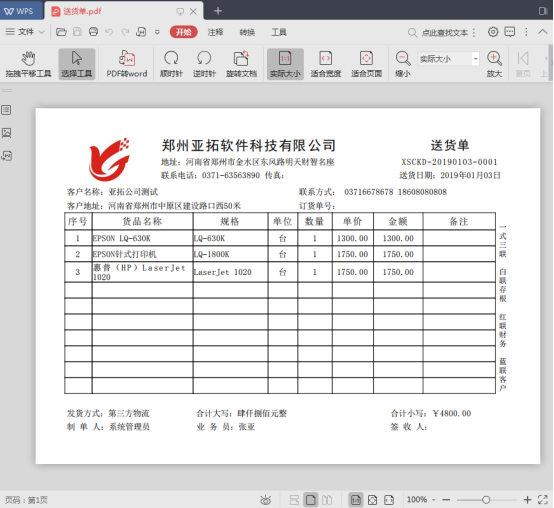 信管飛送貨單軟件、信管飛RMS、信管飛倉庫管理軟件等都支持打印送貨單(銷售單),軟件支持把送貨單預(yù)覽界面導(dǎo)出到Excel文件、Html文件、Text文件及jpg、pdf等電子檔格式,方便用戶導(dǎo)出送貨單的電子檔給客戶看,方便客戶可以隨時查看送貨單內(nèi)容。下面我們以信管飛送貨單軟件為例講一下如何把送貨單預(yù)覽界面導(dǎo)出為pdf格式。