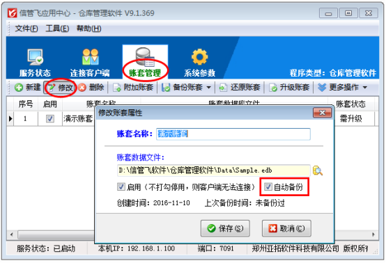 信管飛送貨單軟件、信管飛RMS、信管飛出納記賬軟件、信管飛倉庫管理軟件及信管飛票據(jù)軟件都支持設(shè)置賬套自動(dòng)備份,我們強(qiáng)烈建議啟用自動(dòng)備份功能,以便賬套出現(xiàn)問題的時(shí)候從賬套備份文件中恢復(fù)數(shù)據(jù)。下面我們以信管飛倉庫管理軟件為例詳細(xì)介紹一下如何啟用賬套自動(dòng)備份功能? 首先打開軟件應(yīng)用中心主界面,點(diǎn)擊“系統(tǒng)參數(shù)”—》“賬套備份參數(shù)”,