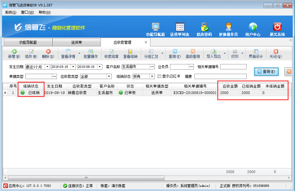 收款結算單用來登記收款信息(收款對象即客戶、收款賬戶、收款金額、經手人等),并結銷應收款記錄。本篇文章以送貨單打印軟件為例演示一下對應收款進行收款結算的操作步驟。 在功能導航窗點擊“往來管理”—》“應收款管理”可以打開應收款管理界面,應收款管理是對包括銷售應收款、期初應收款、其他應收款等各類應收款項的集中管理。應收款記錄一般