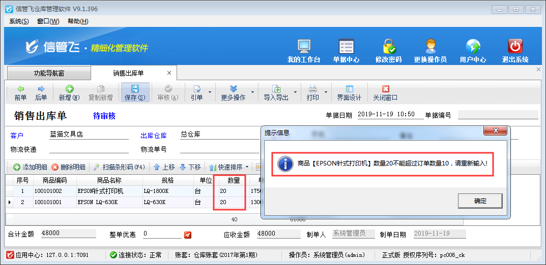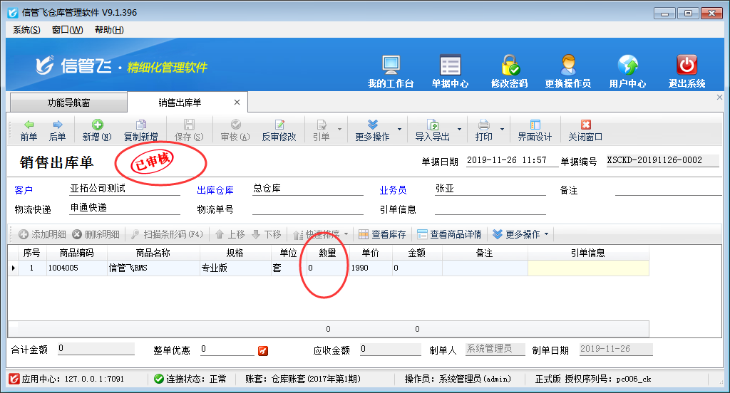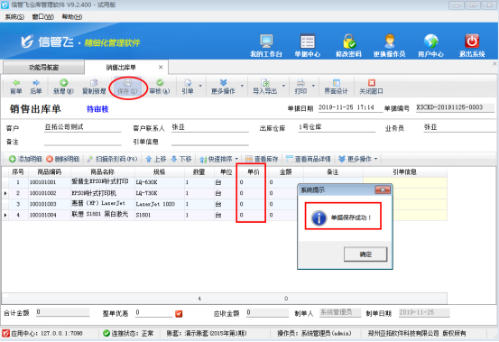信管飛RMS、信管飛倉庫管理軟件、信管飛送貨單軟件等在業務單據保存時如果商品單價為0,系統會彈出提示信息,是否需要繼續保存,如下圖1所示,這樣以免用戶在添加商品明細時忘了填寫單價,好及時錄入,但是有一部分用戶在開單據時只需要填寫商品數量,不需要填寫單價,該怎么設置系統才能不彈出以下提示信息呢?本篇文章以信管飛倉庫管理軟件為例介紹一下如何設置出庫單保存時商品單價