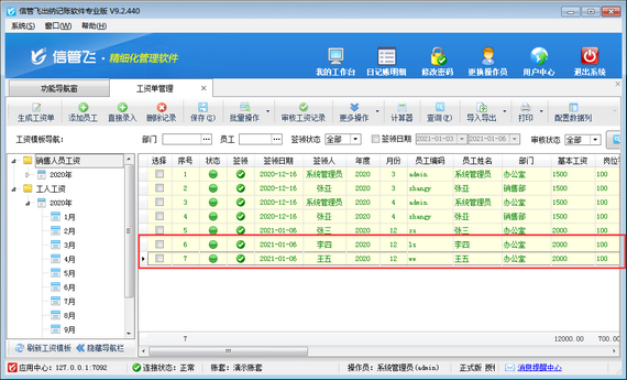信管飛出納記賬軟件專業版包括工資管理功能,支持自定義工資模板,可根據設置的工資模板快速生成工資單,支持從上月工資單復制工資項目數據,工資項目數據錄入完成核對無誤后審核生效,審核后不再支持直接修改。如果工資記錄較多,逐條審核工資記錄會比較耗時,軟件支持批量審核工資記錄,可節省時間提高工作效率。本篇文章介紹一下出納記賬軟件中如何批量審核工資記錄? &nb