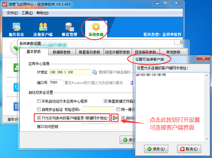 部分信管飛軟件用戶在登錄軟件時會出現軟件登錄不成功的情況,如下圖所示,系統彈出提示信息:應用中心不允許此客戶端連接! 如出現以上問題,可根據下面的解決方法進行解決: 信管飛系列軟件在軟件應用中心中支持設置可連接的客戶端電腦(根據網卡地址判斷),如下圖所示,勾選“只允許列表中的客戶端登錄(根