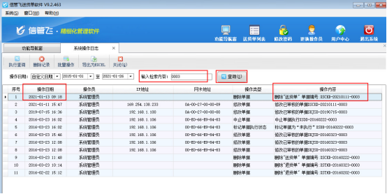 信管飛RMS、信管飛送貨單軟件、信管飛倉庫管理軟件開單保存后都會自動生成單據編號,單據編號流水號依次遞增,單據保存后可以在單據匯總表中查看,方便用戶按單據編號快速查詢單據。 有些用戶的單據已打印,但月底對賬時在軟件的單據匯總表中查不到此單,如下圖1為例,1月份缺少單號“0003”,此種情況可能是單據被誤刪了,可在軟件中查一下