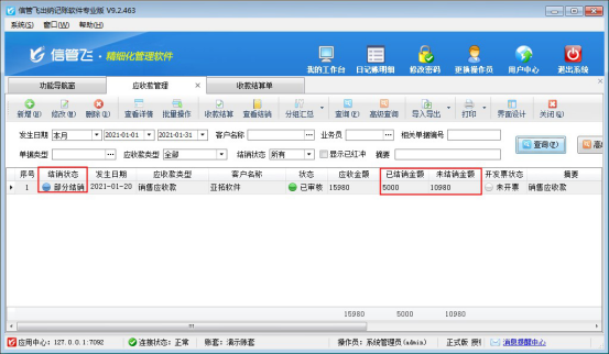 信管飛出納記賬軟件支持登記應收應付款,應收應付款存在分批次結銷情況,本文以“出納記賬軟件應收款”為例,示范下如何部分結銷? 在功能導航窗點擊“往來管理”—》“應收款管理”進入應收款管理界面,在應收款管理界面選擇未結銷的應收款,點擊工具欄的“收款結算”進行收款操作,如下圖所示: &