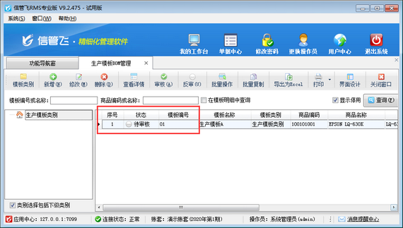 生產模板,即BOM清單(物料清單),可配置每生產一個標準單位的產品需要的原材料種類和數量。生產模板已審核后,不允許直接修改或者刪除,如下圖所示。如生產模板數據維護有誤,需要先將已審核的生產模板反審至待審核的狀態,然后在修改(刪除)生產模板即可。 在生產模板BOM管理界面,選擇一個已審核的生產模板,在工具欄中點擊“反審”按鈕,