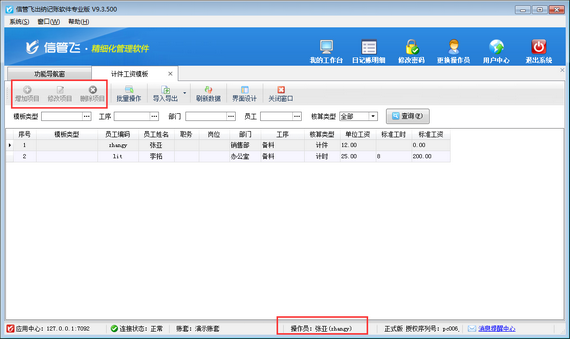 信管飛出納記賬軟件內支持計件工資管理功能,可以對公司內部根據計件進行核算工資的員工工資進行管理,本篇文章介紹一下出納記賬軟件內如何設置操作員不可維護計件工資模板? 在功能導航窗點擊“系統管理”—》“操作員及授權”,打開操作員管理及授權界面,選擇操作員“張亞”,在其右側的功能模塊權限內選擇“綜合管理”模塊,將“計件工資模板”的